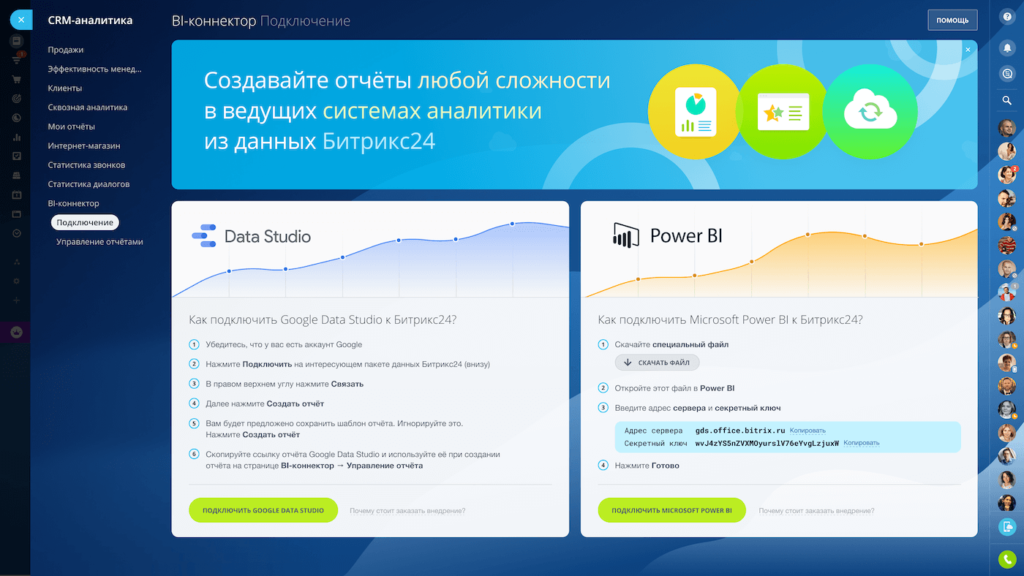 Анализируйте данные, которые накапливаются в Битрикс24, с помощью Google DataStudio или Microsoft PowerBI. Создавайте отчеты любой сложности, чтобы отслеживать необходимые показатели. Добавляйте отчеты из аналитических систем в CRM-аналитику и настраивайте доступ для разных сотрудников.