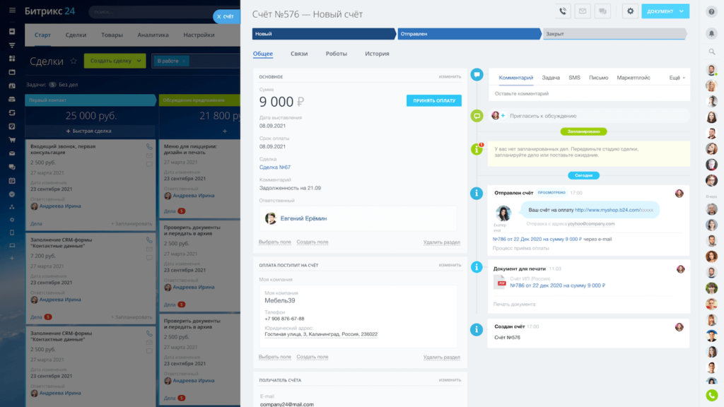 Создавайте шаблоны счетов или используйте готовые для быстрой отправки клиентам. Распечатывайте документы прямо из CRM, отправляйте счета для оплаты по QR-коду или другими способами. В карточке счета вы увидите, что клиент открыл ссылку и оплатил выставленный счет. А роботы и триггеры помогут автоматизировать весь процесс.