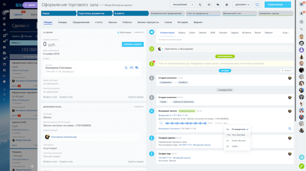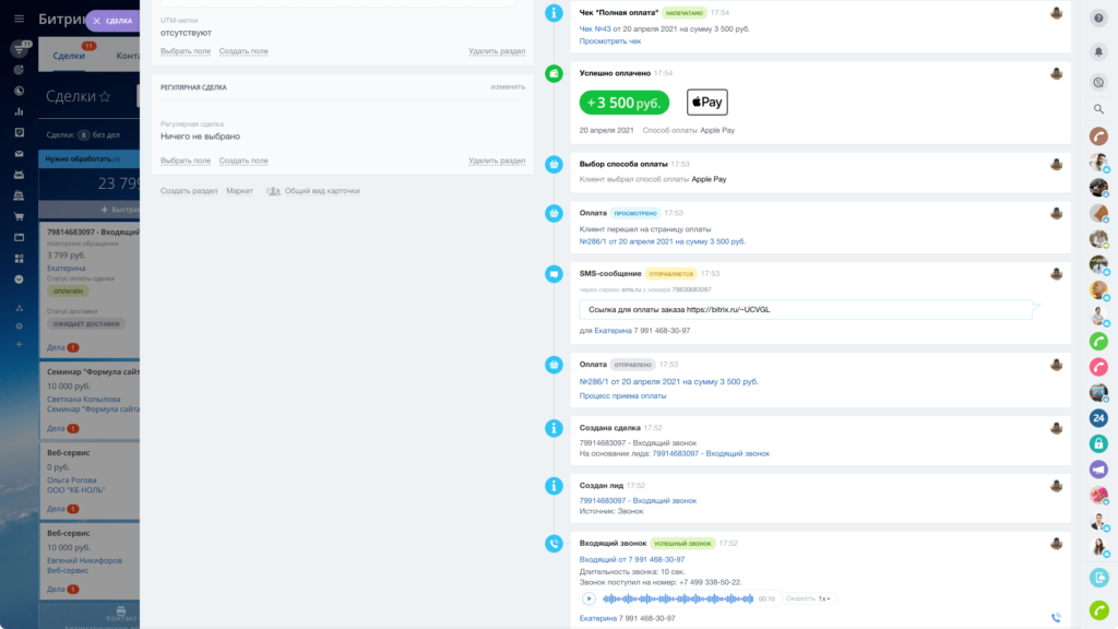 Ответы на эти вопросы есть в карточке CRM для каждой сделки.