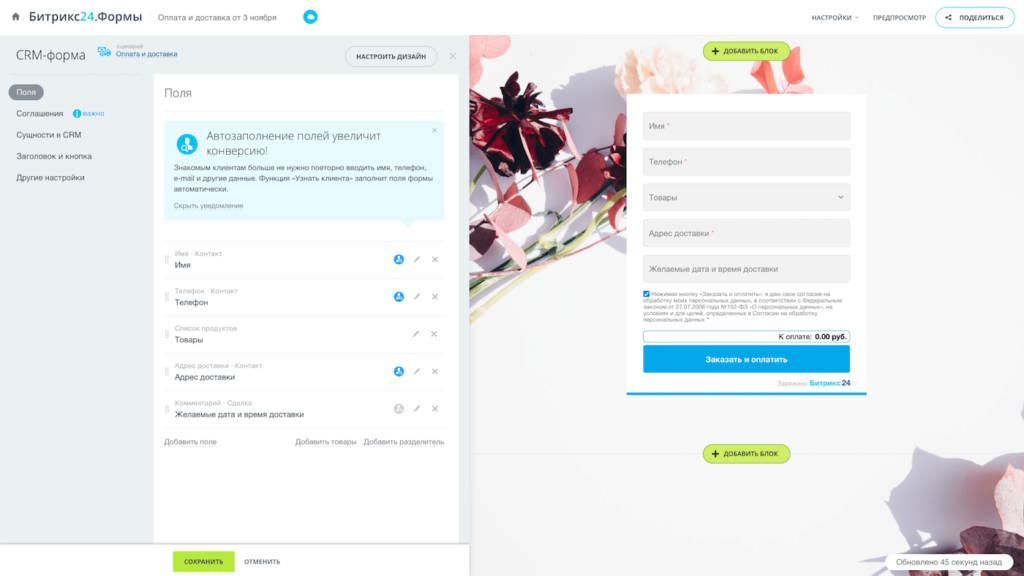 - Формы с оплатой товаров, доставкой и еще 20+ готовых сценариев
