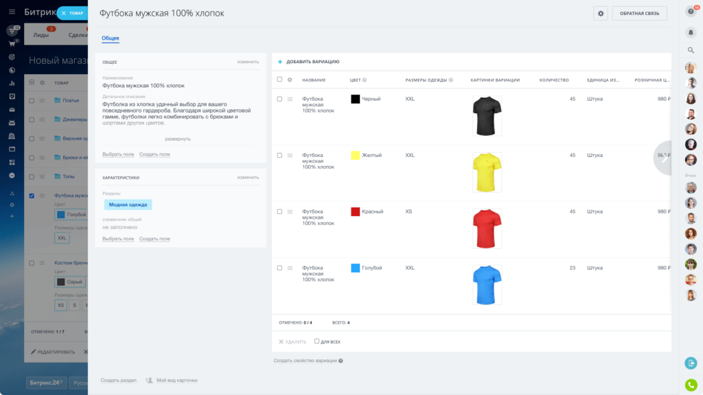Меняйте описание и цены, выставляйте вариации SKU (торговые предложения), добавляйте скидки и сравнение товаров, управляйте остатками и ценами вариаций. Наполнение каталога доступно прямо из сделки или счета в CRM.