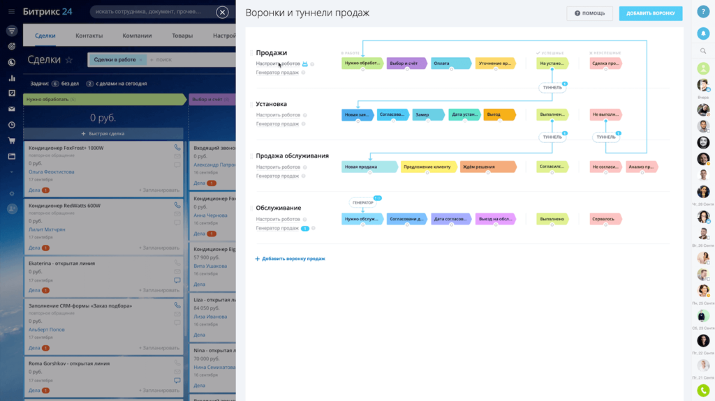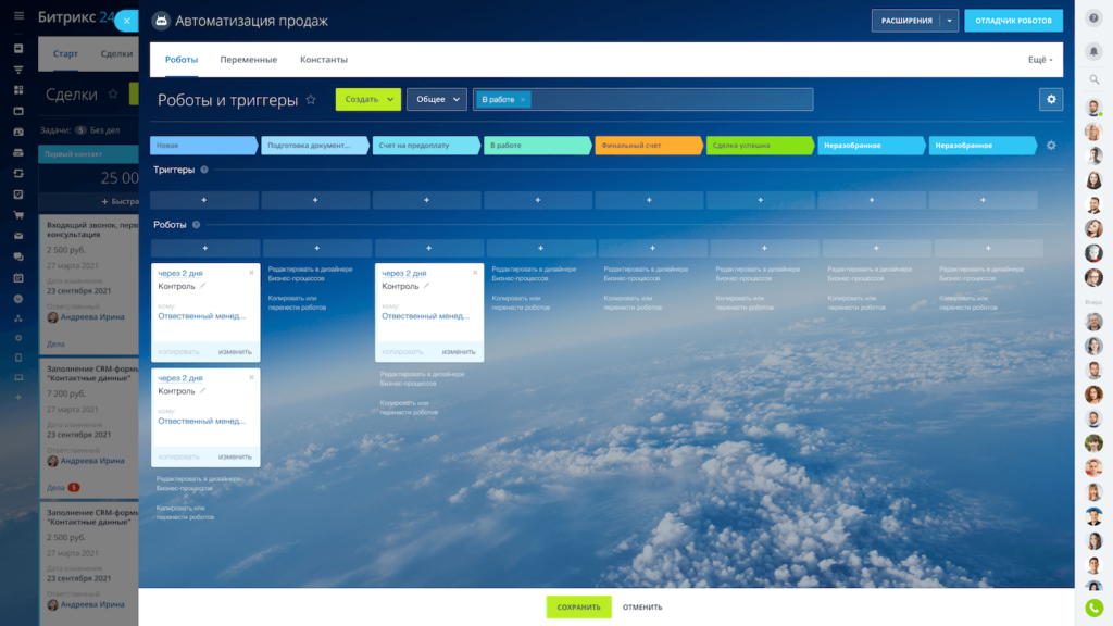 Быстрая и удобная настройка воронки продаж между различными стадиями со встроенным генератором продаж. Просто нарисуйте путь покупателя от одной стадии продажи к следующей, а Битрикс24 без вашего вмешательства построит бизнес-процессы по вашему сценарию.