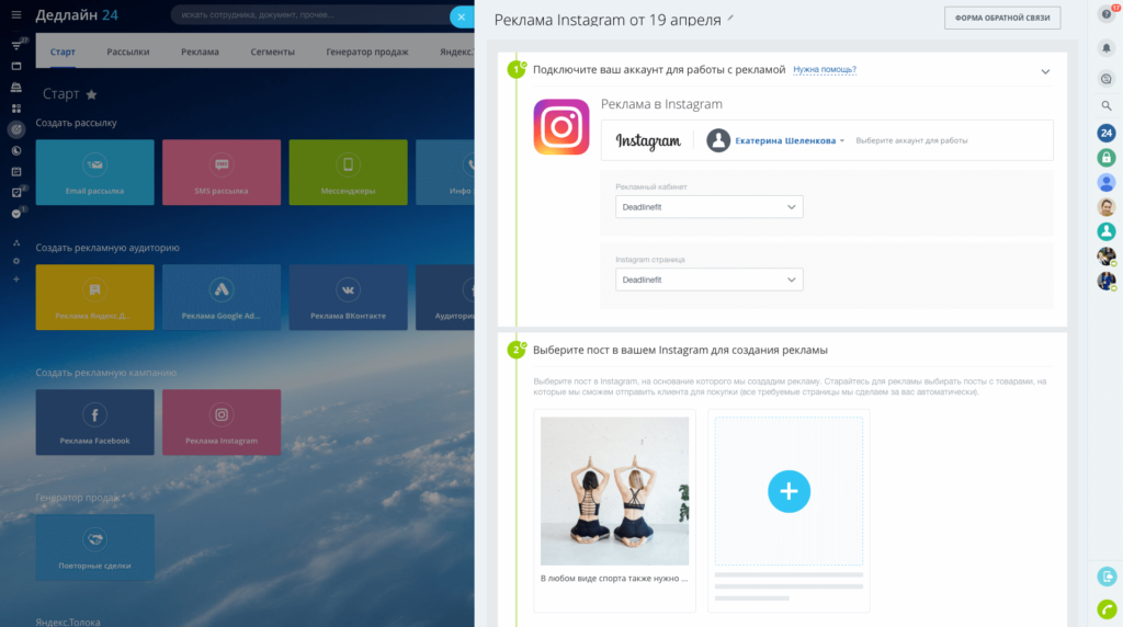 Подключите ваш бизнес-аккаунт в Facebook или Instagram и Битрикс24 поможет вам найти новых клиентов через рекламу в соцсетях. Не нужно специальных навыков, чтобы создать эффективную рекламную кампанию – система подскажет, что делать.